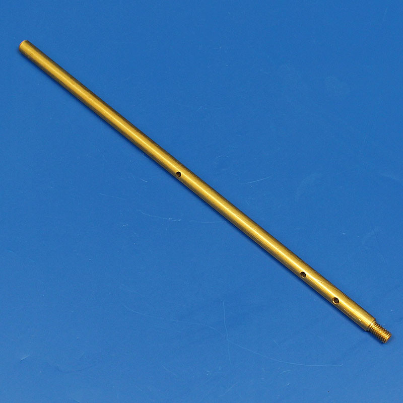 Lucas CWX type wiper motor spindle. Made from brass. 165mm long, 5mm diameter, 6mm long threaded section at one end, three cross holes 1.5mm diameter at 20mm, 34mm and 88mm from the threaded end.